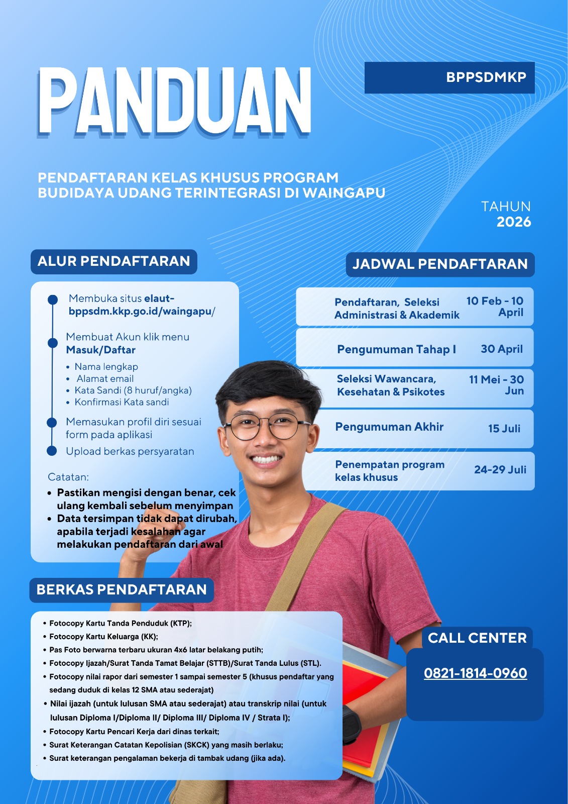 - Peserta kelas khusus bersedia menandatangani surat pernyataan bahwa jika dalam kurun waktu 3 (tiga) bulan untuk operator anak kolam, dan 6 (enam) bulan untuk teknisi/laboran yang tidak memenuhi standar hasil evaluasi, maka peserta pelatihan bersedia untuk dikeluarkan dari program kelas khusus.
